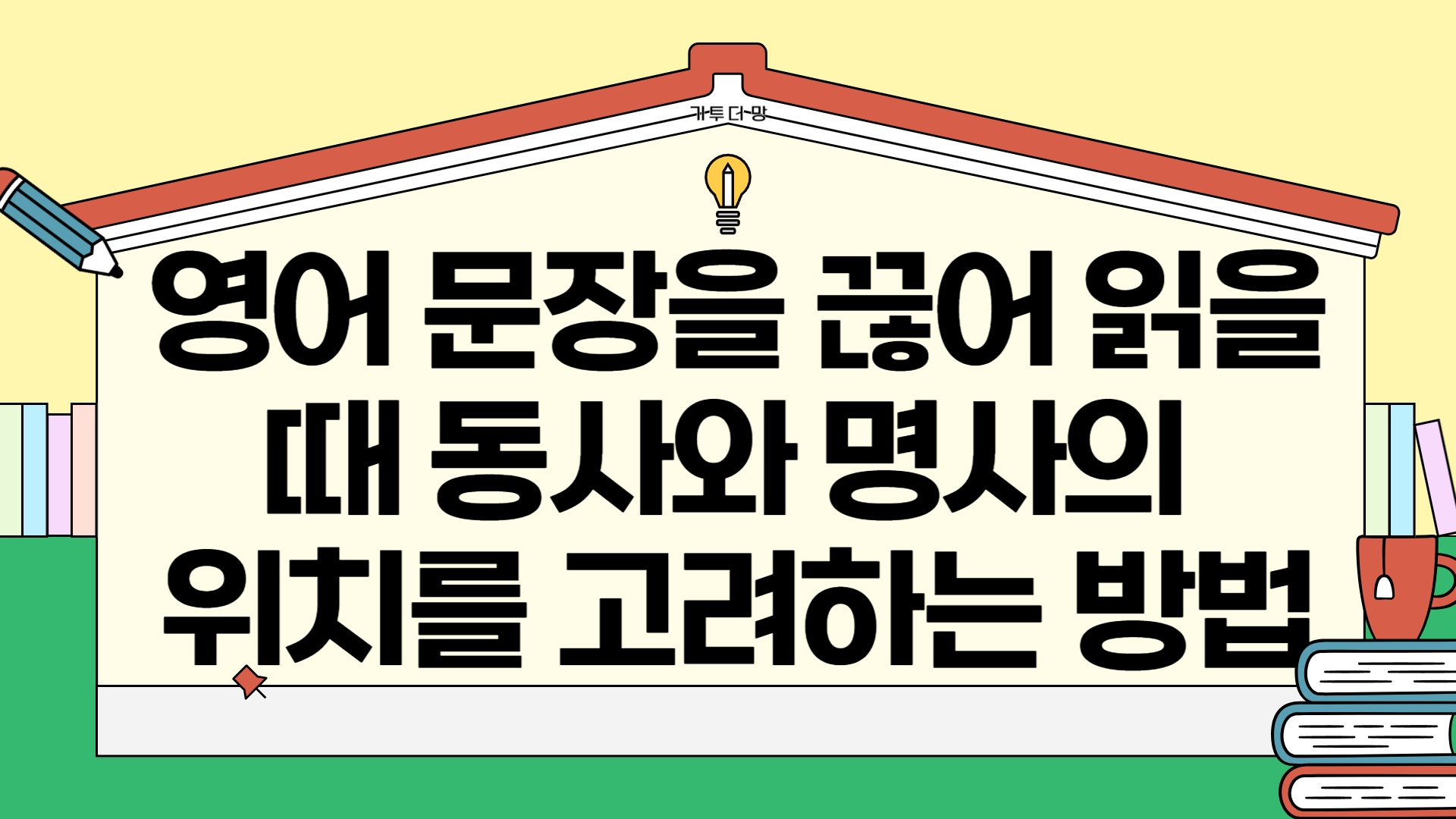 - 타동사 뒤에 명사(목적어)가 오면, 목적어가 짧으면 그 뒤에서, 목적어가 길면 목적어 앞에서 끊어 읽습니다